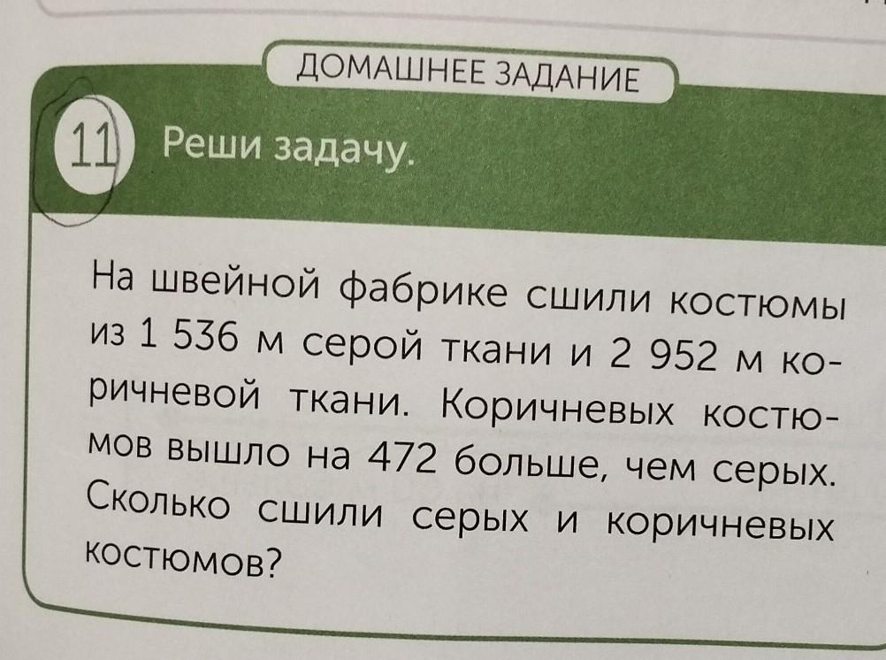 ДОМАШНЕЕ ЗАДАНИЕ 11 Реши задачу. На швейной фабрике сшили костюмы из 1 536 м серой ткани и 2 952 м ко- ричневой ткани. Коричневых костю- мов вышло на 472 больше, чем серых. Сколько сшили серых и коричневых костюмов? пожалуйста можете фото прекрепить