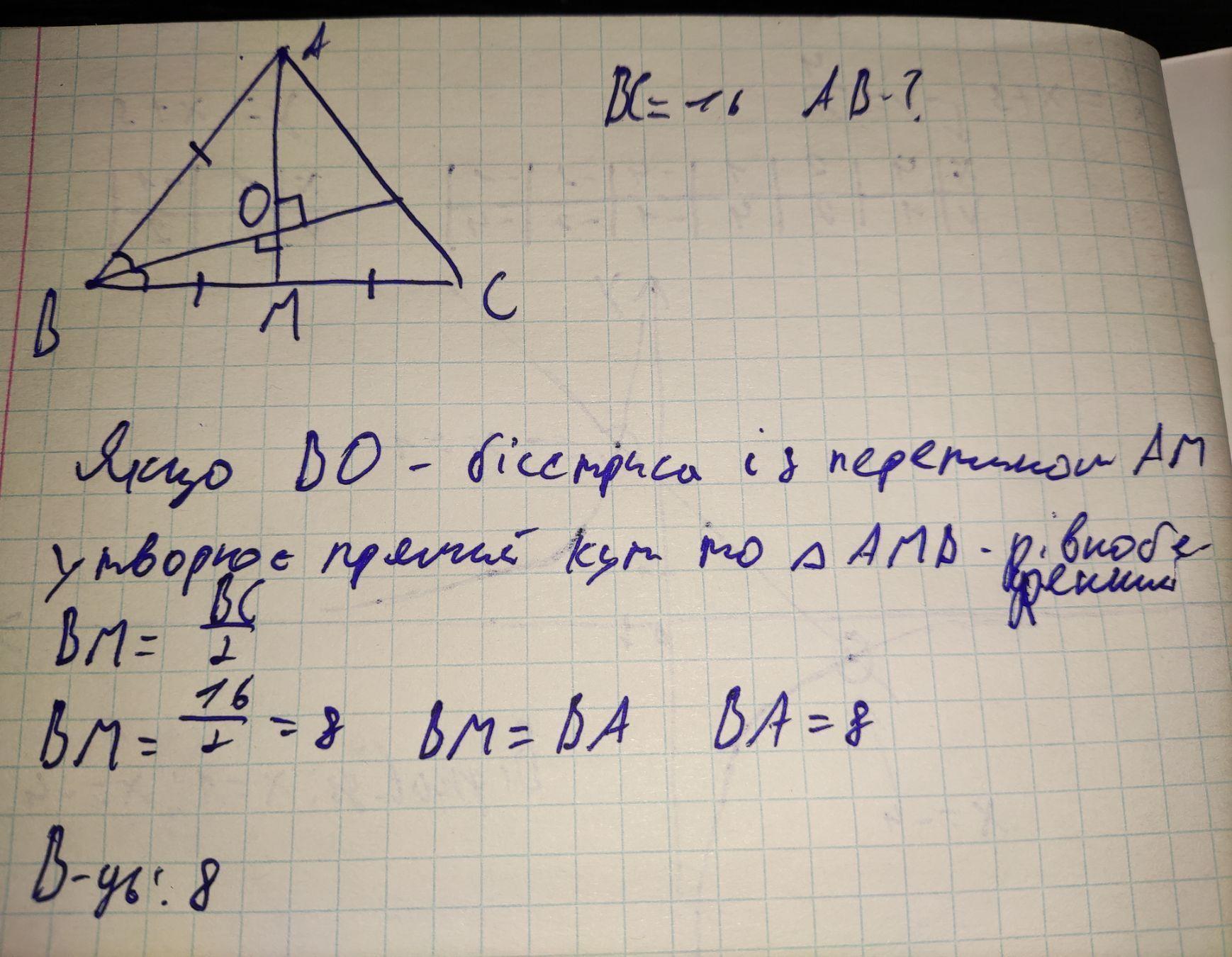 медіана АМ трикутника ABC перпендикулярна до його бісектриси БК знайдіть сторону ав якщо BC равно 16
