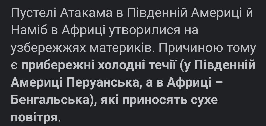 Пустелі Атакама в Південній Америці й Наміб в Африці утворилися на узбережжях материків. Причиною тому є прибережні холодні течії (у Південній Америці Перуанська, а в Африці – Бенгальська), які приносять сухе повітря.