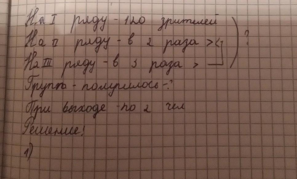 на Первом иду сюда зрителей на втором ряду два раза больше на третьем ряду в три раза больше чем второго Сколько всего зрителей группа получилась неизвестно при выходе по два человека пж делайте