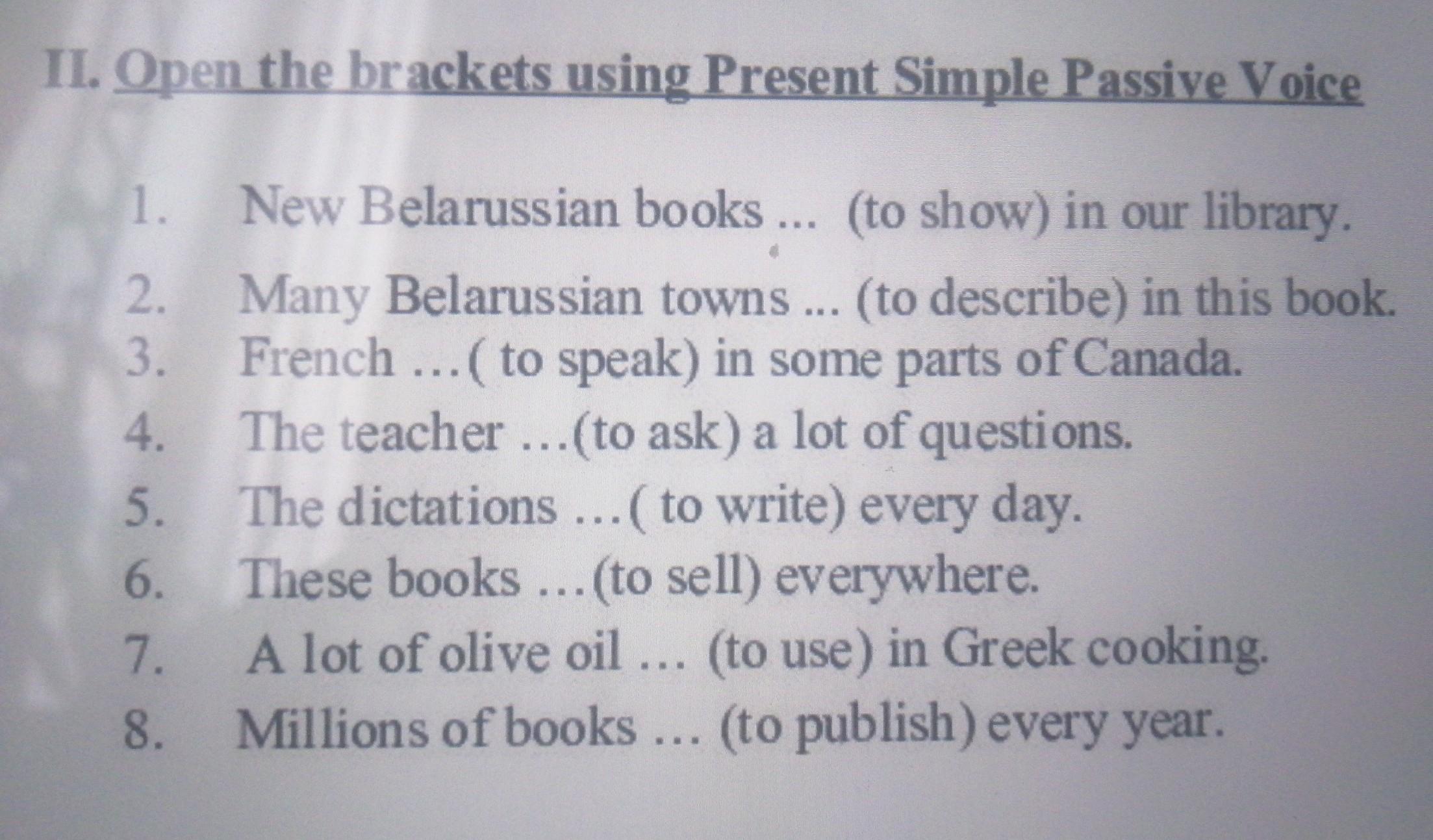 1 are shown 2 are described 3 is spoken 4 is asked 5 are written 6 are sold 7 is used 8 are published Объяснение: