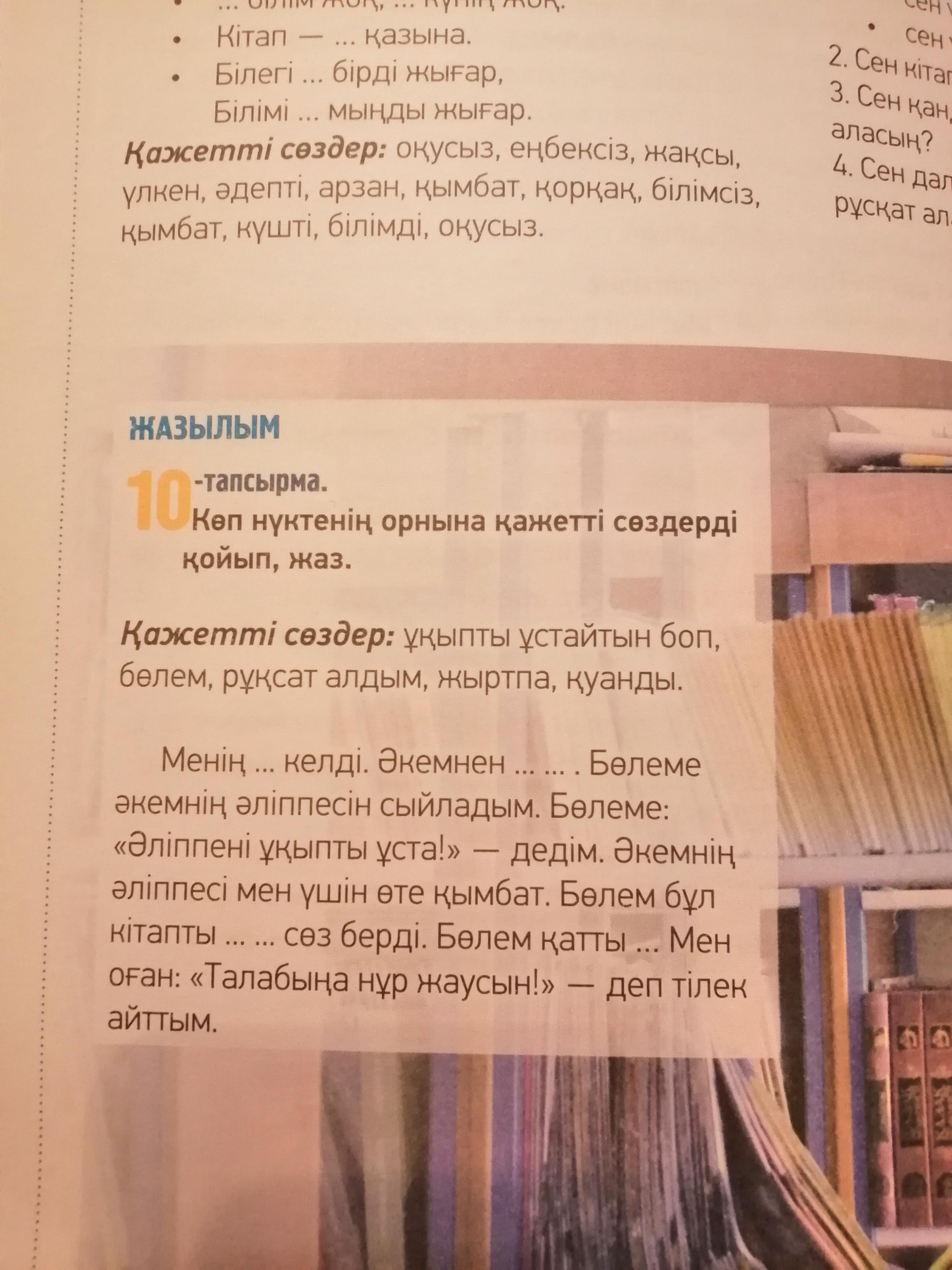 Менің бөлеме келді.Әкемнен рұқстан алдым.Бөлеме әкемнің әліппесін сыйлайдым.Бөлеме:«әліппені ұқыпты ұста»-деді.Әкемнің әліппесі мен үшін өте қымбат.Бөлем бұл кітапті ұқыпты ұстауға сөз берді.Бөлем қатты қуанды.мен оған«Талабына нұр жаусын!»-деп тілек айттым.