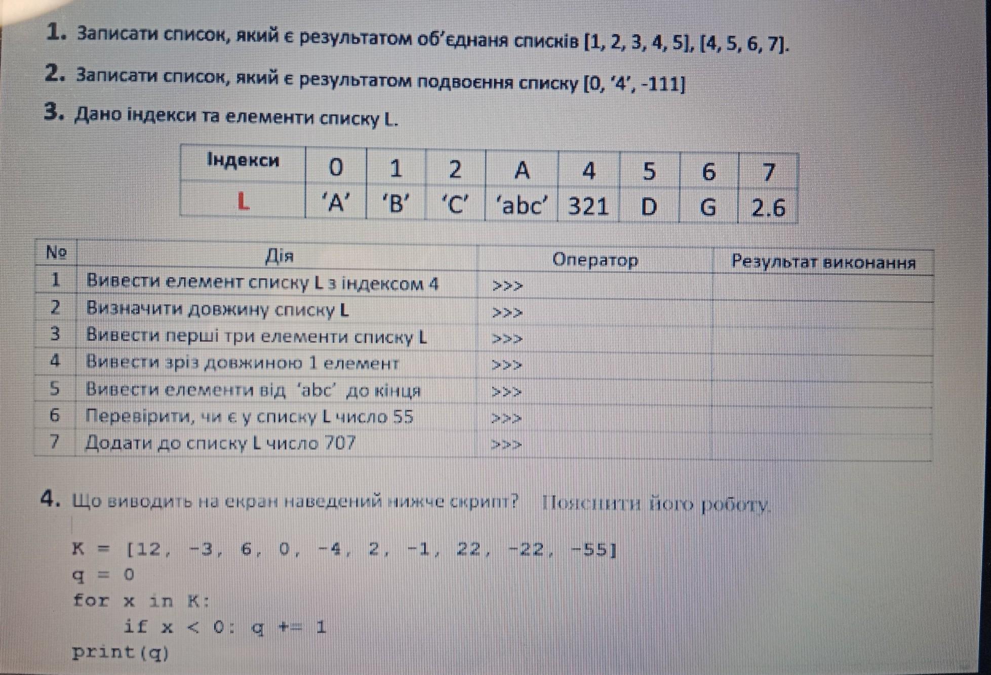 Потім число q далі за допомогою цикла for послідовно обходимо список K і зберігаємо числа у змінній х, і кожен раз перевіряємо чи х меньше за 0? Якщо так то до змінної q додаємо 1