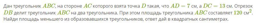 Дан треугольник ABC, на стороне AC которого взята точка D такая, что AD=7 см, а DC=13 см. Отрезок DB делит треугольник ABC на два треугольника. При этом площадь треугольника ABC составляет 120 см2.