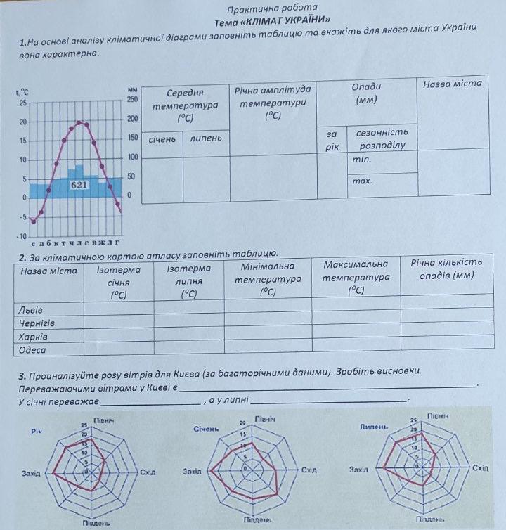 1. Климат диаграммасы негізінде кестені толтырып, Украинаның қай қаласына тән екенін көрсетіңіз