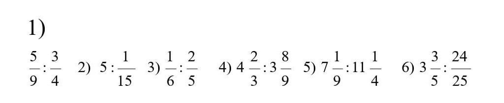 1) 5/9 : 3/4 = 5/9 : 4/3 = 5×4/9×3 = 20/27;