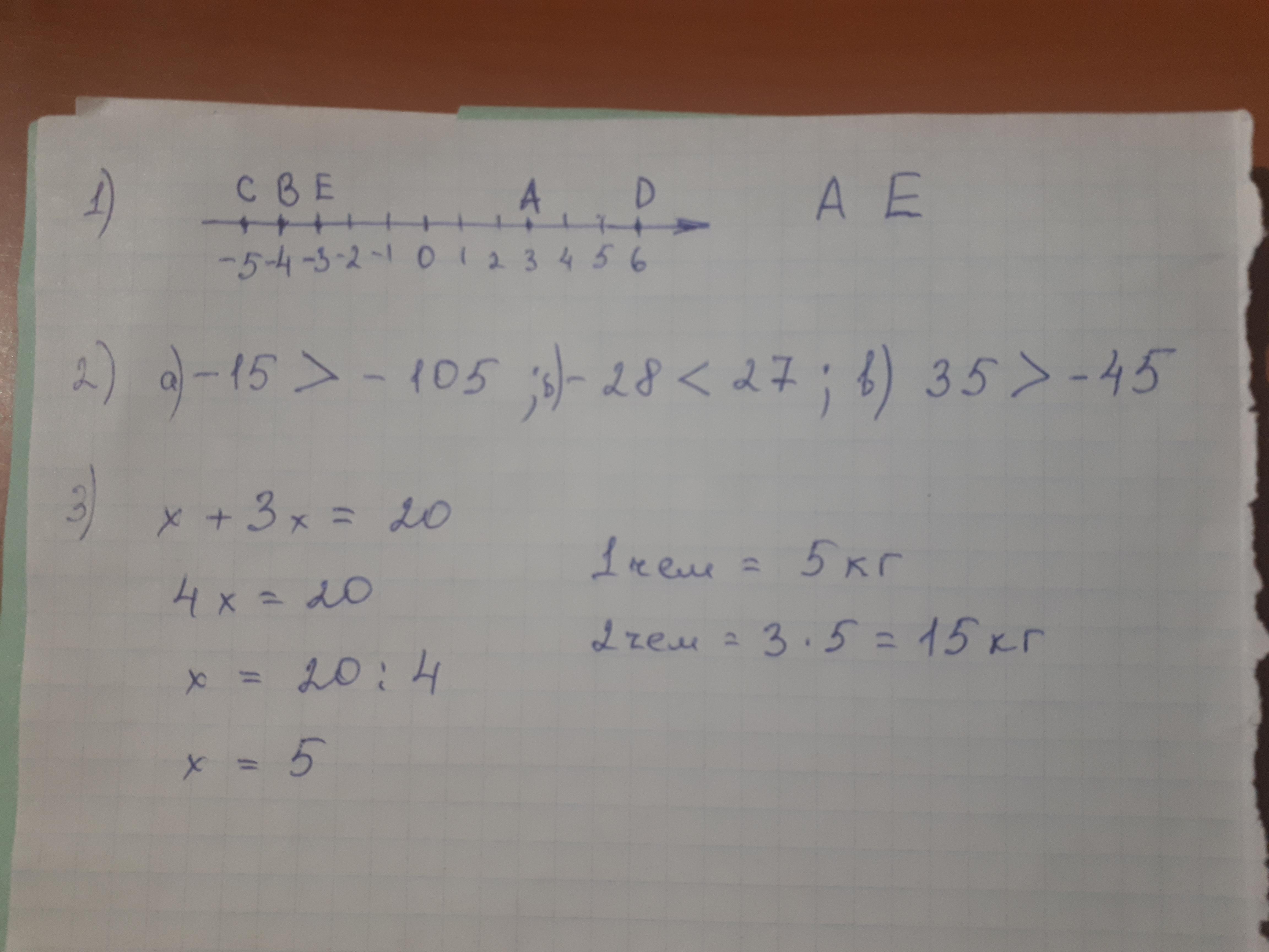 1.Отметьте на координатной прямой точки B(-4),A (3) ,C (-5), D (6) ,E (-3). Какие из этих точек имеют противоположные координаты? 2.Сравните числа а) -15 и -105; б) -28 и 27; в) (35)+(-45). 3. решите задачу с помощью уравнения. Масса двух чемоданов 20 кг. Масса одного из них в три раза больше массы другого. Найдите массу каждого чемодана. срочно помогите дам 20 баллов