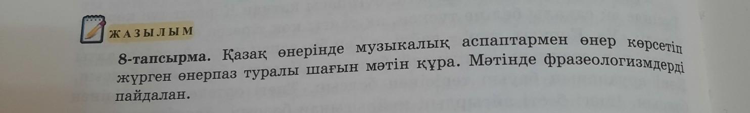 ЖА З Ы Л Ы М 8-тапсырма. Қазақ өнерінде музыкалық аспаптармен өнер көрсетіп жүрген өнерпаз туралы шағын мәтін құра. Мәтінде фразеологизмдерді пайдалан.