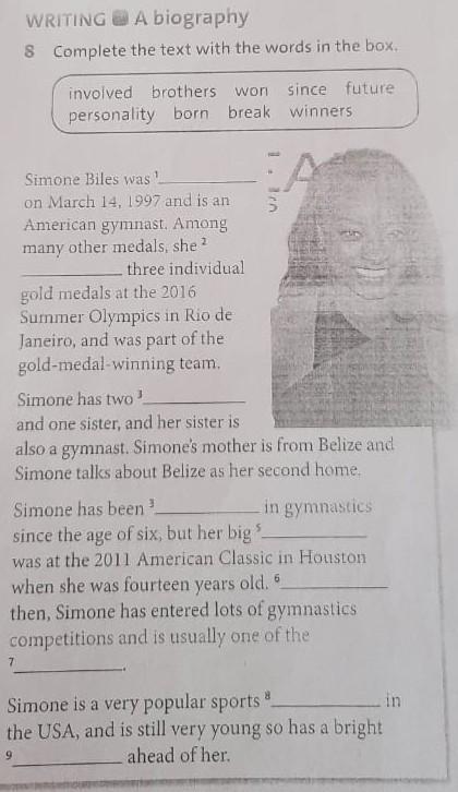 8 Complete the text with the words in the box. involved brothers won since future personality born break winners Simone Biles was ' on March 14, 1997 and is an American gymnast. Among many other medals, she 2 three individual gold medals at the 2016 Summer Olympics in Rio de Janeiro, and was part of the gold-medal-winning team. 7 Simone has two ³. and one sister, and her sister is also a gymnast. Simone's mother is from Belize and Simone talks about Belize as her second home. in gymnastics Simone has been ³ since the age of six, but her big was at the 2011 American Classic in Houston. when she was fourteen years old. then, Simone has entered lots of gymnastics competitions and is usually one of the Simone is a very popular sports in the USA, and is still very young so has a bright ahead of her.