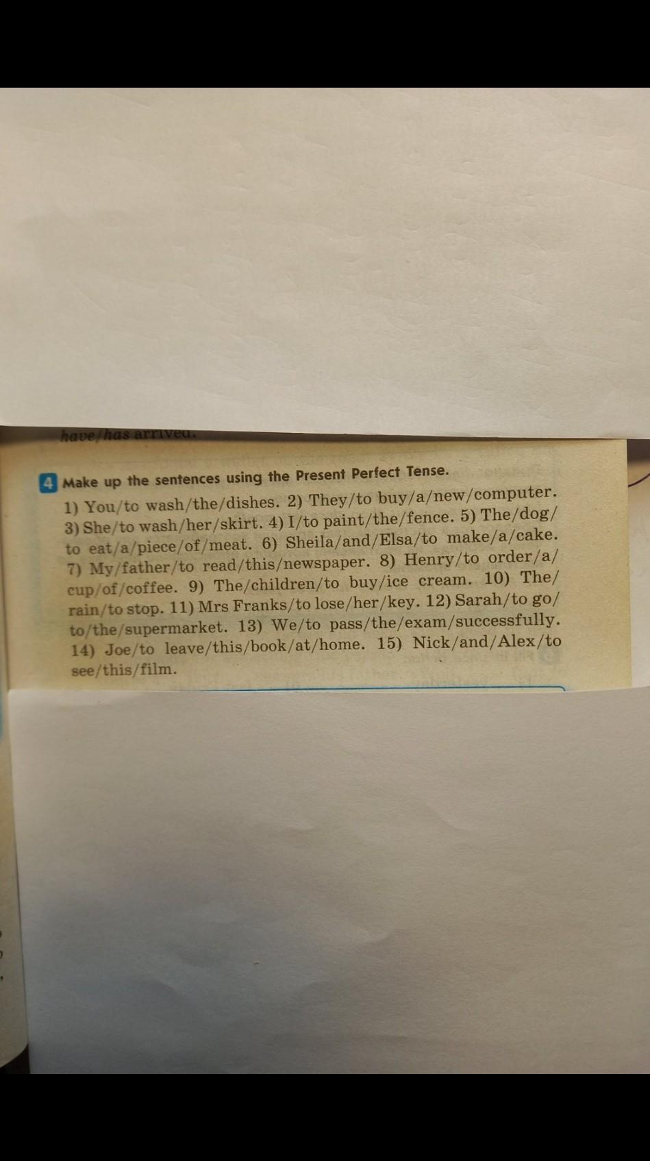 1) You HAVE WASHED the dishes. 2) They HAVE BOUGHT a new computer. 3) She HAS WASHED her skirt. 4) I HAVE PAINTED the fence. 5) The dog HAS EATEN a piece of meat. 6) Sheila and Elsa HAVE MADE a cake. 7) My father HAS READ this newspaper. 8) Henry HAS ORDERED a cup of coffee. 9) The children HAVE BOUGHT ice cream. 10) The rain HAS STOPPED. 11) Mrs Franks HAS LOST her key. 12) Sarah HAS GONE to the supermarket. 13) We HAVE PASSED the exam successfully. 14) Joe HAS LEFT this book at home. 15) Nick and Alex HAVE SEEN this film.