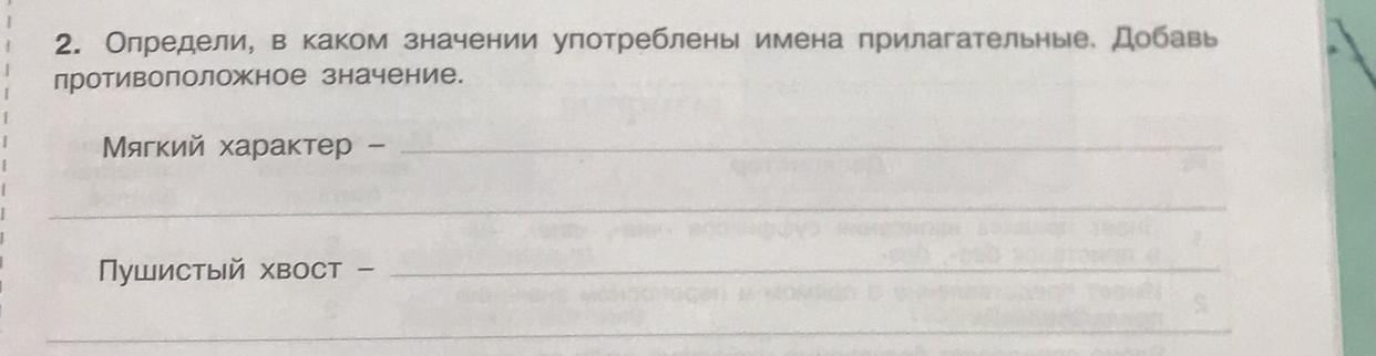 Русский язык 2. Определи в каком значении употреблины имена прилагательные. Добавь противоположное значение