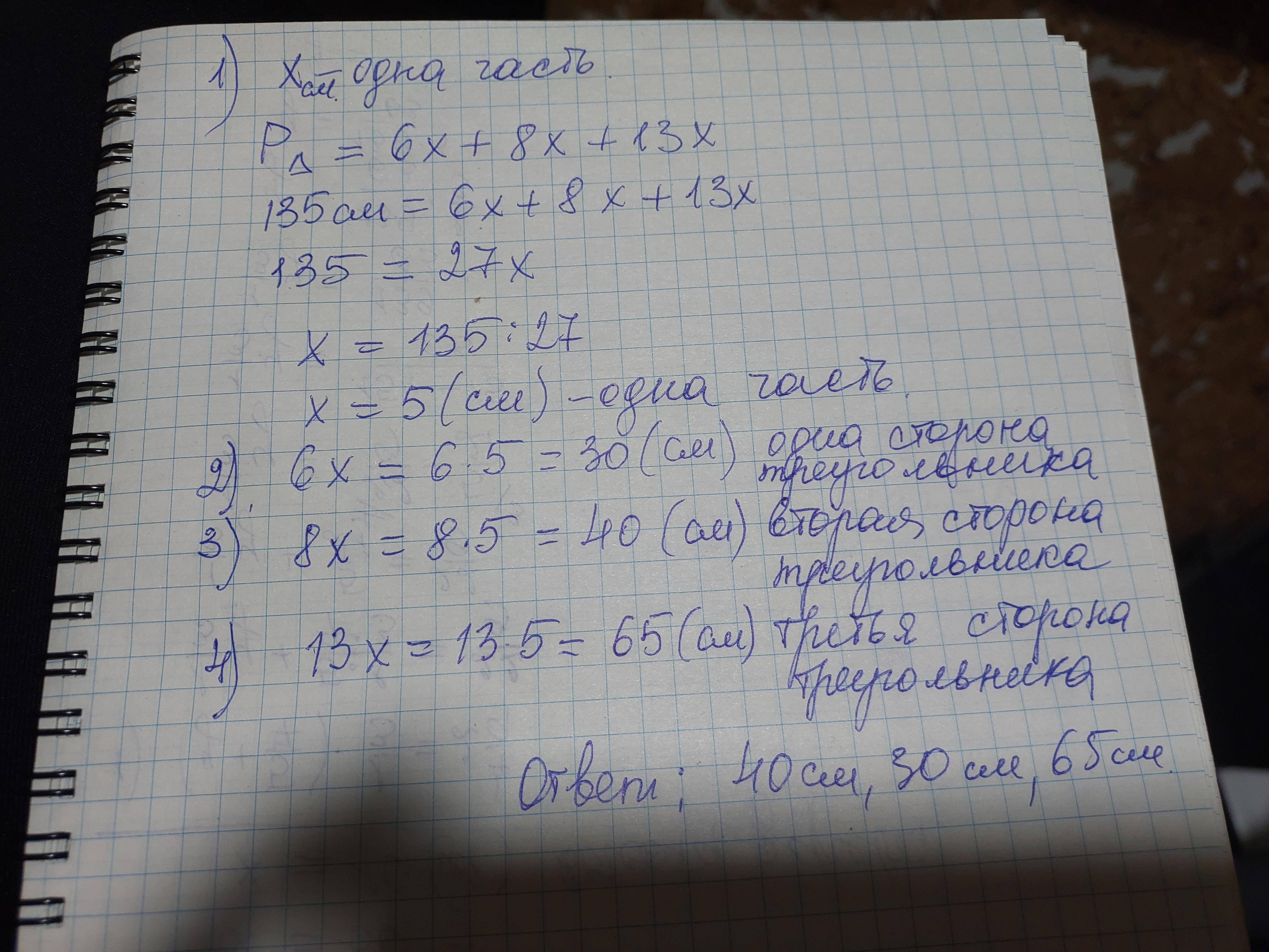 Периметр трикутника дорівнює 135 см, а довжини сторін відносяться як 6 : 8 : 13. Знайдіть довжини сторін трикутника.