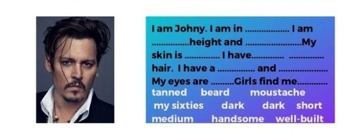 I am Johny. I am in..................... am ...................height and ...................My skin is................. I have................................. hair. I have a ................. and My eyes are ............Girls find me..…....... (tanned, beard, moustache, my sixties, dark, dark, short, medium, handsome, well-built)