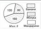 на малюнку зображено кругову діаграму фруктів (у кг), завезених до магазину. На скільки яблук завезено менше, ніж мандарин