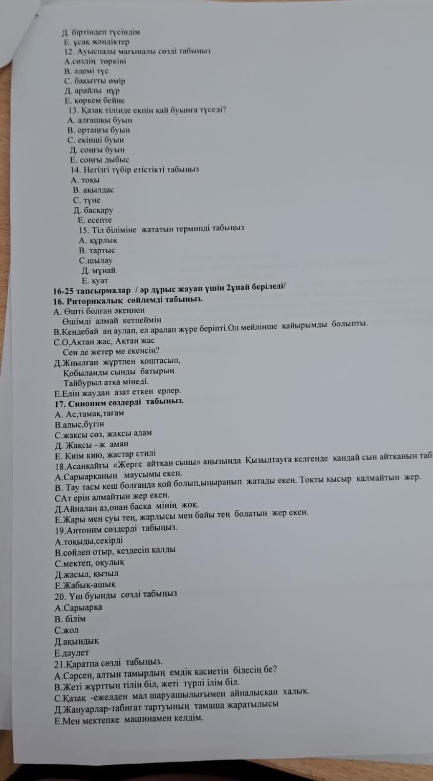 Д. бiртiндеп түсіндім Е. усак жәндіктер 12. Ауыспалы магыналы создi табыныз А.создiн торкiнi В. әдемi тус С. бакытты омiр Д. арайлы нур Е. керкем бейне 13. Казак тiлiнде екпiн кай буынга туседi? А. алгашкы буын В. ортангы буын С. екінші буын Д. сонгы буын Е. сонгы дыбыс 14. Негiзгi түбiр етiстiктi табыныз А. токы В. акылдас С.Туне Д. баскару Е. есепте 15. Тiл бiлiмiне жататын терминдi табыныз А. курлык В. тартыс С.шылау Д. мунай Е. куат 16-25 тапсырмалар /эр дұрыс жауап ушiн 2упай берiледi 16. Риторикалык сойлемді табыңыз. А. Өштi болган экеннен Өшiмдi алмай кетпеймiн В.Кендебай ан аулап, ел аралап жүре берiптi. Ол мейлінше кайырымды болыпты. С.О.Актан жас, Актан жас Сен де жетер ме екенсiн? Д.Жиылган журтпен коштасып, Кобыланды сынды батырын Тайбурыл атка мiнедi. Е.Елiн жаудан азат еткен ерлер. 17. Синоним сөздердi табыныз. А. Ас,тамак,тагам В.алыс,бугiн C.жаксы сөз, жаксы адам Д. Жаксы-ж аман Е. Киiм кию, жастар стилі 18.Асанкайгы «Жерге айткан сыны» анызында Қызылтауға келгенде кандай сын айтканын та А.Сарыарканын маусымы екен. B. Tay Tacb кеш болганда кой болып,ыныранып жатады екен. Токты кысыр калмайтын жер. CAT ерiн алмайтын жер екен. Д.Айналан азонан баска мiнiн жок. Е.Жары мен суы тен, жарлысы мен байы тең болатын жер екен. 19.Антоним сөздерді табыңыз. А.токыды,секірді В.сойлеп отыр, кездесiп калды С.мектеп, окулык Д.жасыл, кызыл Е.Жабык-ашык 20. Yш буынды сездi табыныз А.Сарыарка В. бiлiм С.жол Д.акындык Е.дәулет 21.Қаратпа сөзді табыңыз. А.Сәрсен, алтын тамырдын емдiк касиетiн бiлесiн бе? В.Жеті жұрттың тiлiн бiл, жетi турлi iлiм бiл. С.Казак -ежелден мал шаруашылығымен айналыскан халык. Д.Жануарлар-табигат тартуынын тамаша жаратылысы Е.Мен мектепке машинамен келдім.