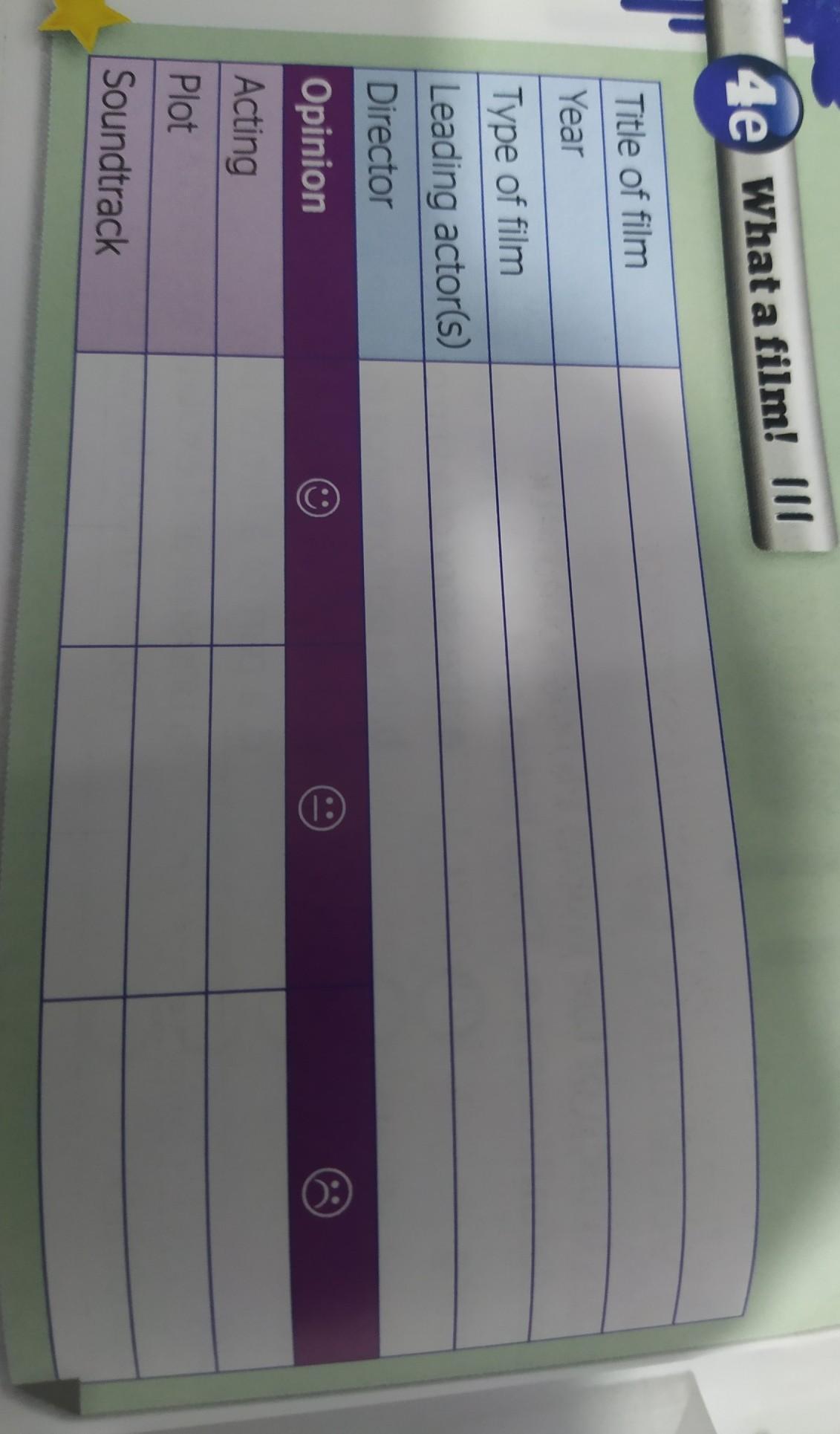 Speak & Write A. Read the text and complete the table. Alexander and the Terrible, Horrible, No Good, Very Bad Day Alexander and the Terrible, Horrible, No Good, Very Bad Day (2014) is not the most catchy title for a comedy, but it does make you laugh. Miguel Arteta directs a team of amazing actors. Ed Oxenbould stars as Alexander Cooper, a boy who feels that only bad things happen to him. However, for his family, everything is going well. His brother (Dylan Minnette) is learning to drive, his sister (Kerris Dorsey) is playing a leading role in her school play, and his parents Wennifer Garner and Steve Carell) are both doing well at work. On his 12th birthday. Alexander blows out a candle on a cupcake and makes a wish: that. just for one day, his family know what it feels like to have a terrible. horrible, no good, very bad day. The next day, everything goes wrong for them. It's awful, but very funny. This is a film that the whole family can enjoy. The actors are all excellent, especially the leading actor Ed Oxenbould, and they made me laugh even though I didn't really enjoy the plot. The music isn't anything special, but that isn't important to me. Most of all, the film sends out a nice message for all of us who know what a bad day feels like! STEVE CARILL Bany ALEXANDER and the Terrible, Horrible, NO GOOD, VERY BAD DAY OCTOBER
