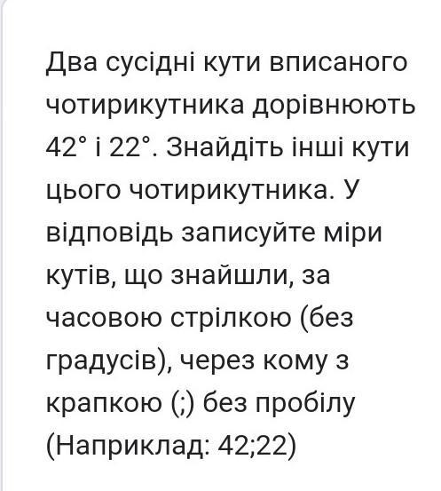 Чтобы найти оставшиеся два угла четырехугольника, нужно сначала найти сумму углов этого четырехугольника. Сумма углов четырехугольника равна 360 градусам. Таким образом, оставшиеся углы четырехугольника равны 360 - 42 - 22 = 296 градусам. Чтобы записать результат в формате, предложенном в задании, нужно записать 296:0. Ответ: 296:0.