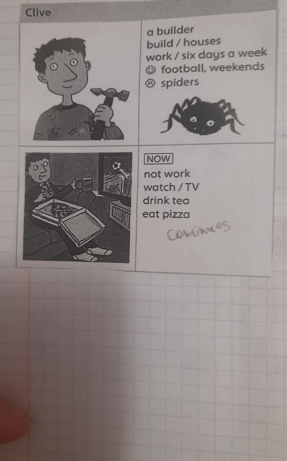 1.Clive is a builder.He builds houses and works six days a week and have a rest for one day.He prefers to play football and likes weekends.But he scaries of spiders.