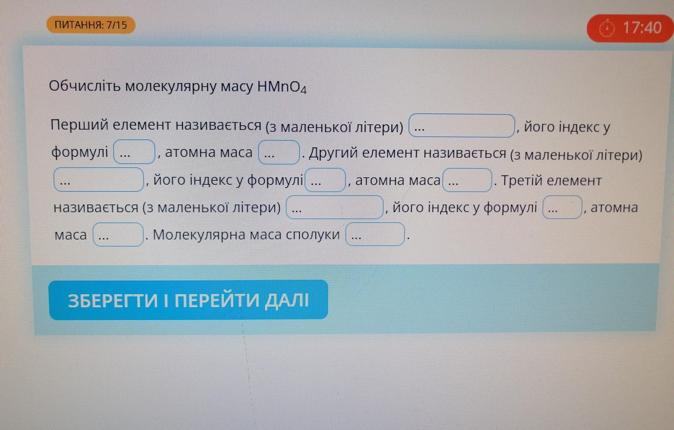 Перший елемент називається гідроген, його індекс у формулі 1, атомна маса 2г/моль. Другий елемент називається марганець, його індекс у формулі 1, атомна маса 55г/моль. Третій елемент називається берилій, його індекс у формулі 4, атомна маса 9г/моль. Молекулярна маса сполуки 119,94 г/моль. Не встигла відповісти