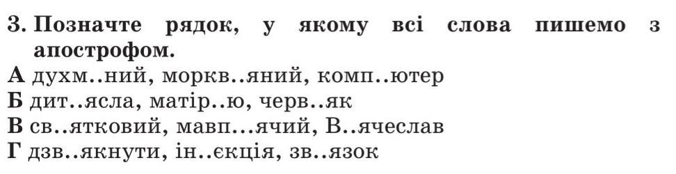 3. Позначте рядок, у апострофом. А духм..ний, моркв..яний, комп..ютер Б дит..ясла, матір..ю, черв..як В св..ятковий, мавп…..ячий, В..ячеслав Г дзв..якнути, ін..єкція, зв..язок якому всі слова пишемо 3
