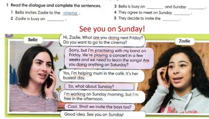1) Bella invites Zadie to the cinema.