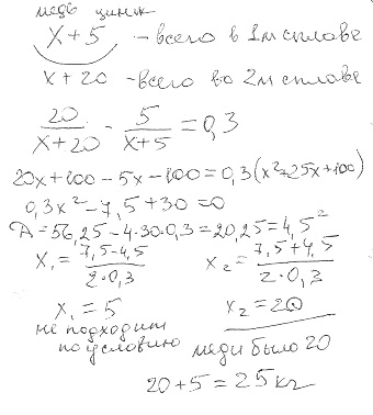В сплав меди и цинка, содержащий 5 кг цинка, добавили 15 кг цинка, после чего содержание цинка в сплаве повысилось на 30%. Какова первоначальная масса сплава, если известно, что в нем меди было больше, чем цинка?