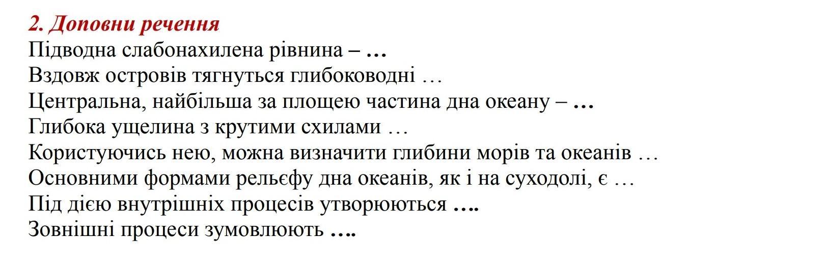 Підводна слабонахилена рівнина - ... Вздовж островів тягнуться глибоководні ….. Центральна, найбільша за площею частина дна океану Глибока ущелина з крутими схилами ... Користуючись нею, можна визначити глибини морів та океанів ... Основними формами рельєфу дна океанів, як і на суходолі, є ... Під дією внутрішніх процесів утворюються .... Зовнішні процеси зумовлюють ....