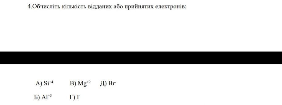 4.Обчисліть кiлькiсть відданих або прийнятих електронів: A) Si+4 Б) Al+3 B) Mg¹2 Д) Br Г) Г