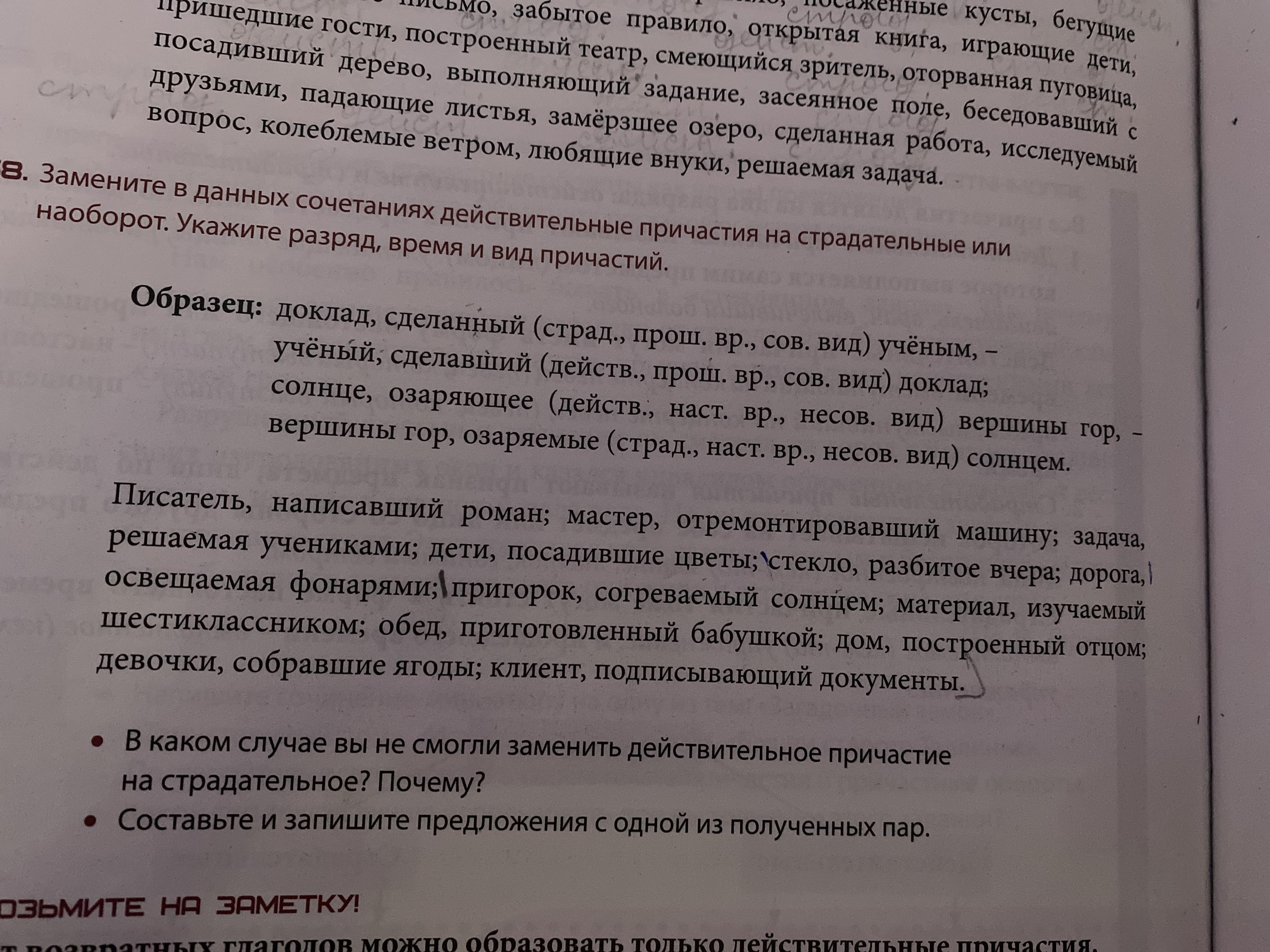 Заменить в сочетаниях действительные причастия на страдательные или наоборот; указать разряд, время и вид причастий: