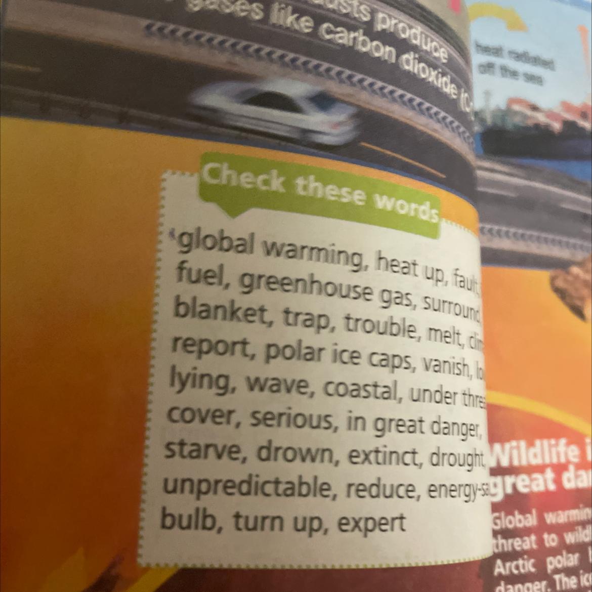Відповідь:глобальне потепління, нагрів, паливо, парниковий газ, навколишня ковдра, пастка, біда, танути, звіт c, полярні льоди, зникнути, лежачи, хвиля, прибережний, під прикриттям, серйозний, у великій небезпеці голодувати, потонути, вимерлий , посуха Wildl непередбачуваний, зменшити, енергоємна лампа, вгору, експерт