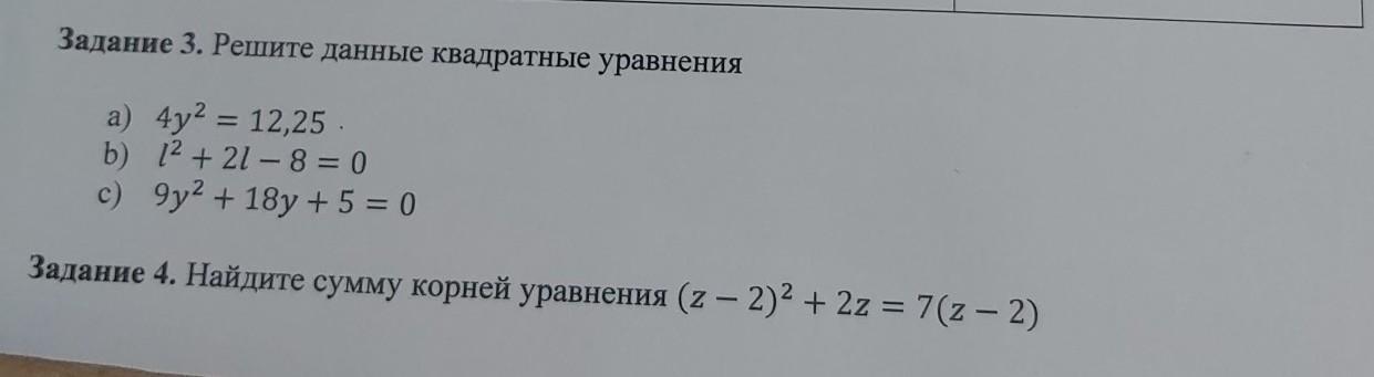 Задание 3. Решите данные квадратные уравнения a) 4y² = 12,25 . b) 12 + 21 - 8 = 0 c) 9y2 + 18y + 5 = 0