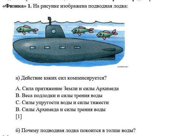 1. На рисунке изображена подводная лодка: 111 а) Действие каких сил компенсируется? А. Сила притяжение Земли и силы Архимеда B. Bеса подлодки и силы трения воды С. Силы упругости воды и силы тяжести В. Силы Архимеда и силы трения воды [1] 6) Почему подводная лодка покоится в толще воды?