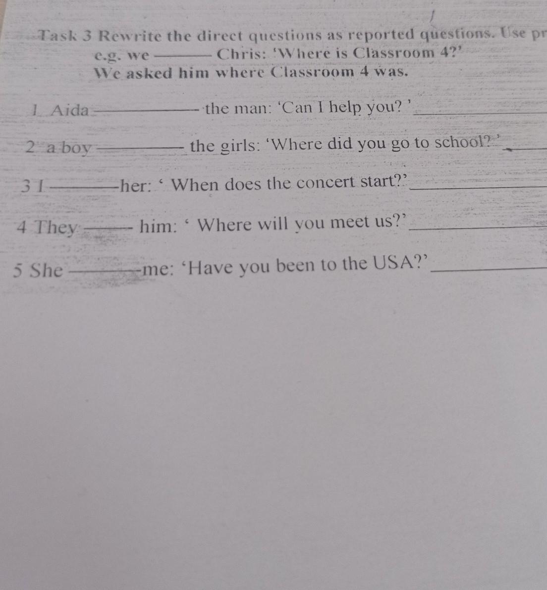 1 Task 3 Rewrite the direct questions as reported questions. Use pronouns. Chris: 'Where is Classroom 4?" 1 Aida e.g. we We asked him where Classroom 4 was. 2 a boy 31 4 They: 5 She the man: 'Can I help you? the girls: 'Where did you go to school? -her: "When does the concert start?? him: Where will you meet us?" -me: 'Have you been to the USA?"
