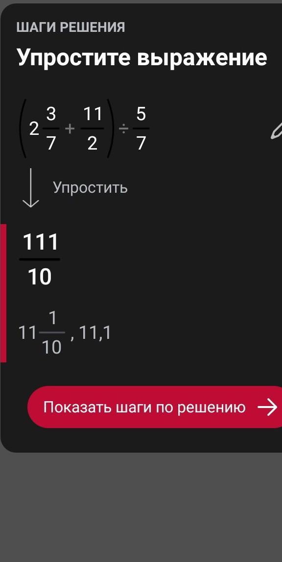 Пошаговое объяснение:(2 3/7+11/2)÷5/7=11 1/10.