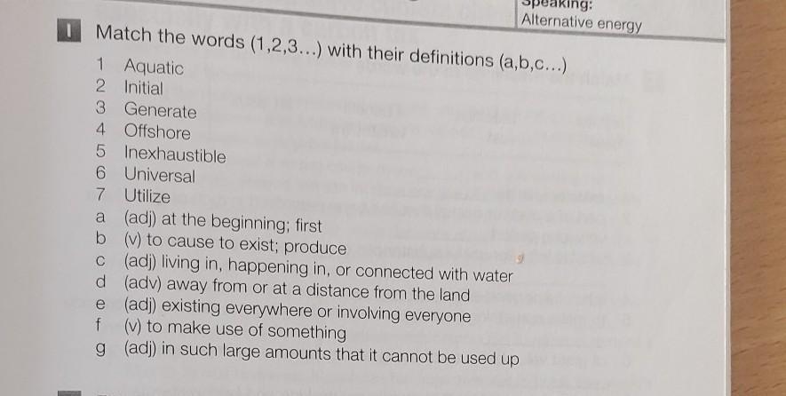 Speaking: Alternative energy Match the words (1,2,3...) with their definitions (a,b,c...) 1 Aquatic 2 Initial 3 Generate 4 Offshore 5 Inexhaustible 6 Universal 7 Utilize a (adj) at the beginning; first b c d e (v) to cause to exist; produce (adj) living in, happening in, or connected with water (adv) away from or at a distance from the land (adj) existing everywhere or involving everyone (v) to make use of something g (adj) in such large amounts that it cannot be used up