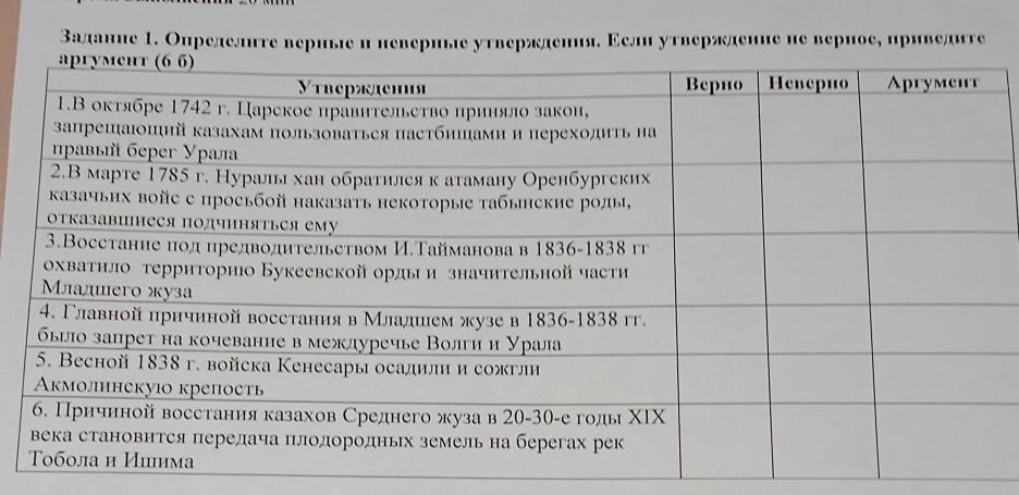 Задание 1. Определите верные и неверные утверждения. Если утверждение не верное, приведите аргумент (6 б) Верно Неверно Аргумент Утверждения 1.В октябре 1742 г. Царское правительство приняло закон, запрещающий казахам пользоваться пастбищами и переходить на правый берег Урала 2.В марте 1785 г. Нуралы хан обратился к атаману Оренбургских казачьих войс с просьбой наказать некоторые табынские роды, отказавшиеся подчиняться ему 3.Восстание под предводительством И.Тайманова в 1836-1838 гг охватило территорию Букеевской орды и значительной части Младшего жуза 4. Главной причиной восстания в Младшем жузе в 1836-1838 гг. было запрет на кочевание в междуречье Волги и Урала 5. Весной 1838 г. войска Кенесары осадили и сожгли Акмолинскую крепость 6. Причиной восстания казахов Среднего жуза в 20-30-е годы XIX века становится передача плодородных земель на берегах рек Тобола и Ишима Задание 23