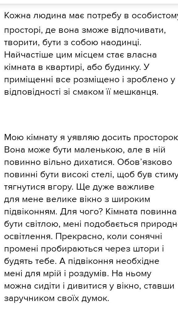 Кімната моєї мрії зовсім невелика, але функціональна, оформлена на мій смак. Стіни спокійного ніжно-лілового кольору, без будь-яких малюнків, спеціально для того, щоб можна було повісити різні плакати, а також грамоти, ну і звичайно ж фотографії мої і моїх друзів. Стеля кімнати оформлений в повітряно-мрійливому стилі, а саме на ньому будуть красиві об’ємні хмари від білого до світло-блакитного кольору.