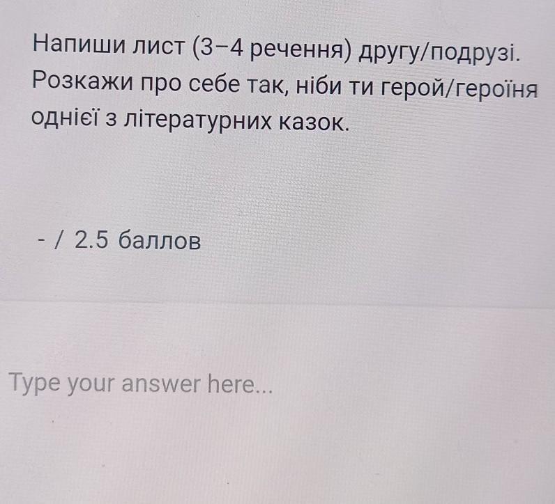 Ответ:привіт, моя дорога подруго! Хочу тобі повідомити, що не давно мені довелося стати героїнею однієї з казок. Це було так несподівано. Було дуже чудово там були феї різноманітні фантастичні істоти, я бачила винаходи які з'являться у майбутньому. Я хочу розповісти тобі про все, давай зустрінемося.