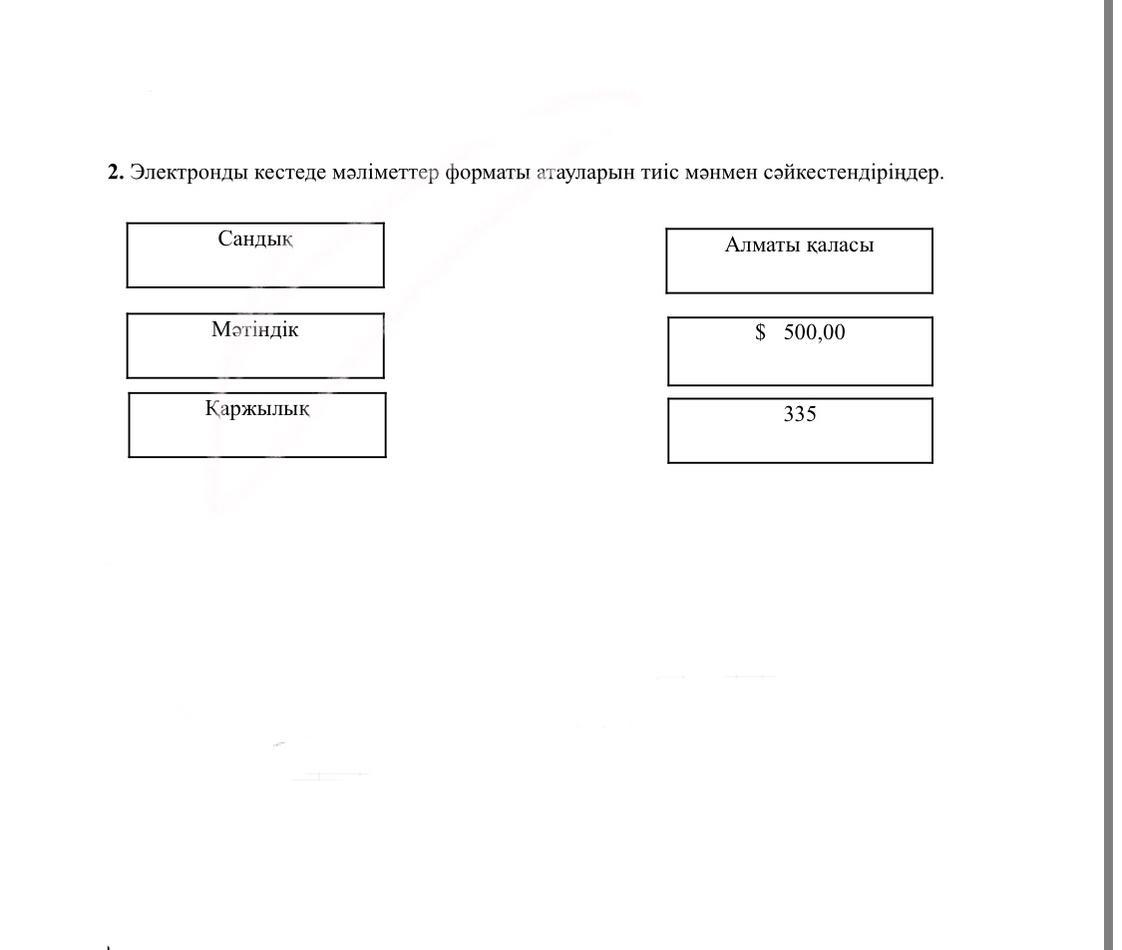2. Электронды кестеде мәліметтер форматы атауларын тиіс мәнмен сәйкестендіріңдер.