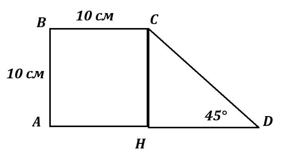 Проведем высоту СН⊥AD - получили треугольник СВР, у которого острые углы равны по 45 градусов. Следовательно треугольник равнобедренный и CH=DH=AB=10 см.