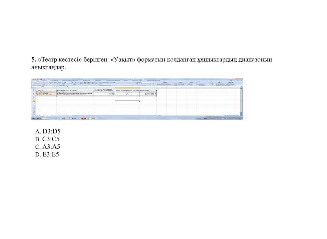 5. <<Театр кестесі» берілген. «Уакыт» форматын қолданған ұяшықтардың диапазонын