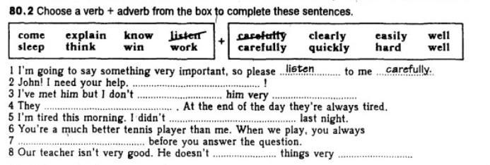 80.2 Choose a verb + adverb from the box to complete these sentences. come explain know listen sleep think win work clearly quickly carefully carefully 1 I'm going to say something very important, so please listen 2 John! I need your help. ! 3 I've met him but I don't. to me...carefully. him very . At the end of the day they're always tired. last night. 4 They 5 I'm tired this morning. I didn't. 6 You're a much better tennis player than me. When we play, you always 7. ...... before you answer the question. good. He doesn't. 8 Our teacher isn't very ..........things very easily well hard well ***** прошу срочно надо!!!