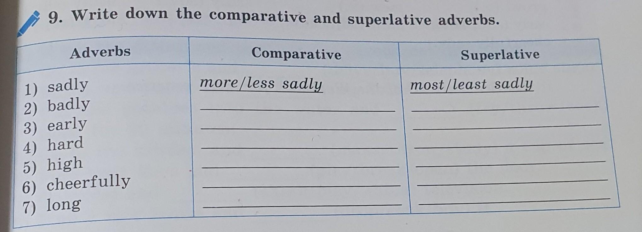 Ответ:sadlier/less sad. the sadliest/ the least sad