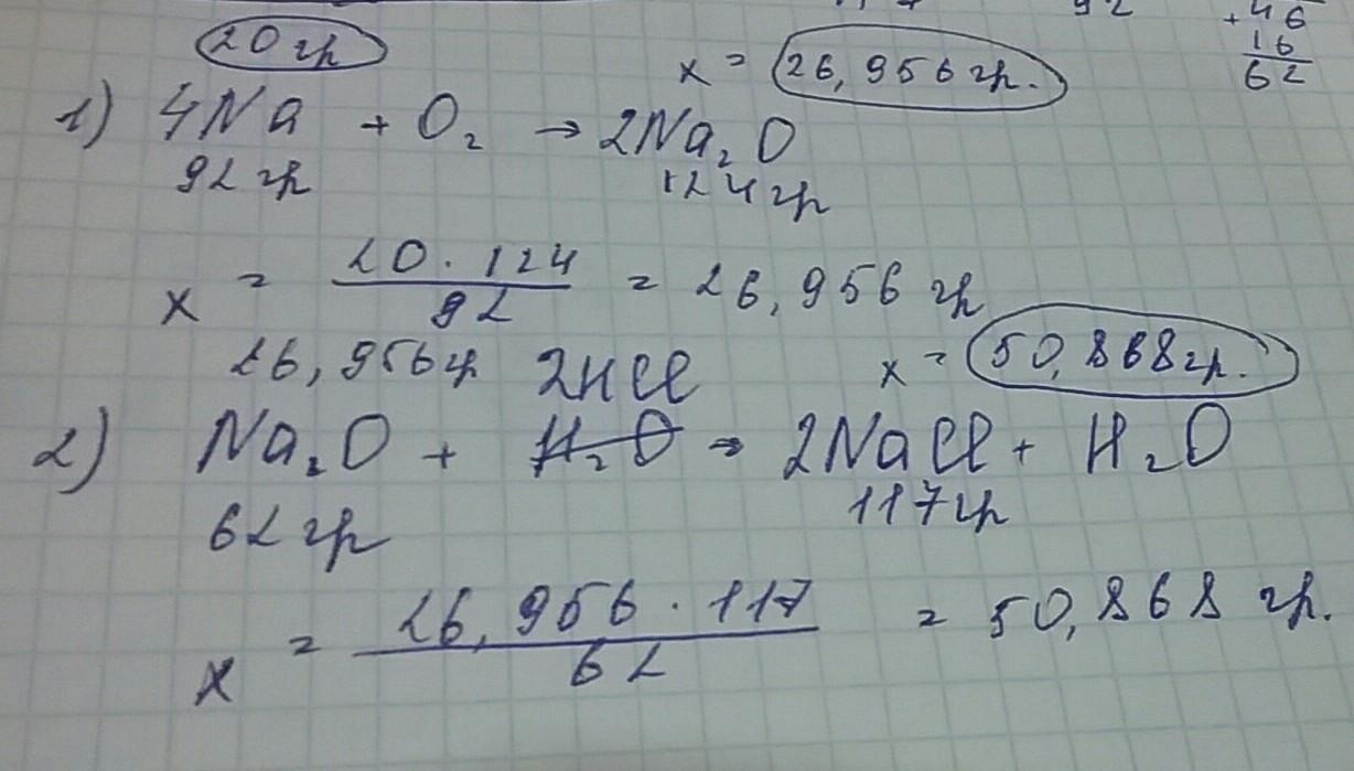 Ученик на уроке провел ряд последовательных реакций: 20 г натрия сжёг в кислороде и полученный оксид натрия растворил в соляной кислоте. Рассчитайте массу полученного продукта каждой реакции.