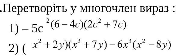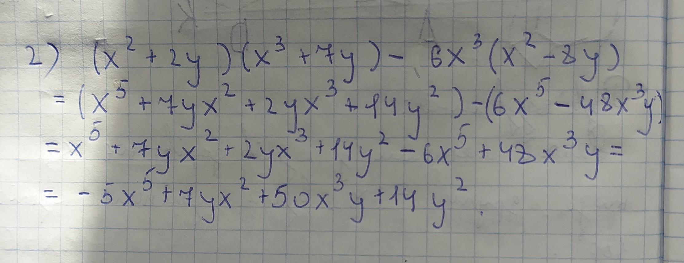 Перетворіть у многочлен вираз : ( x²+2y)(x³ +7y) - 6x³(x2 - 8y)