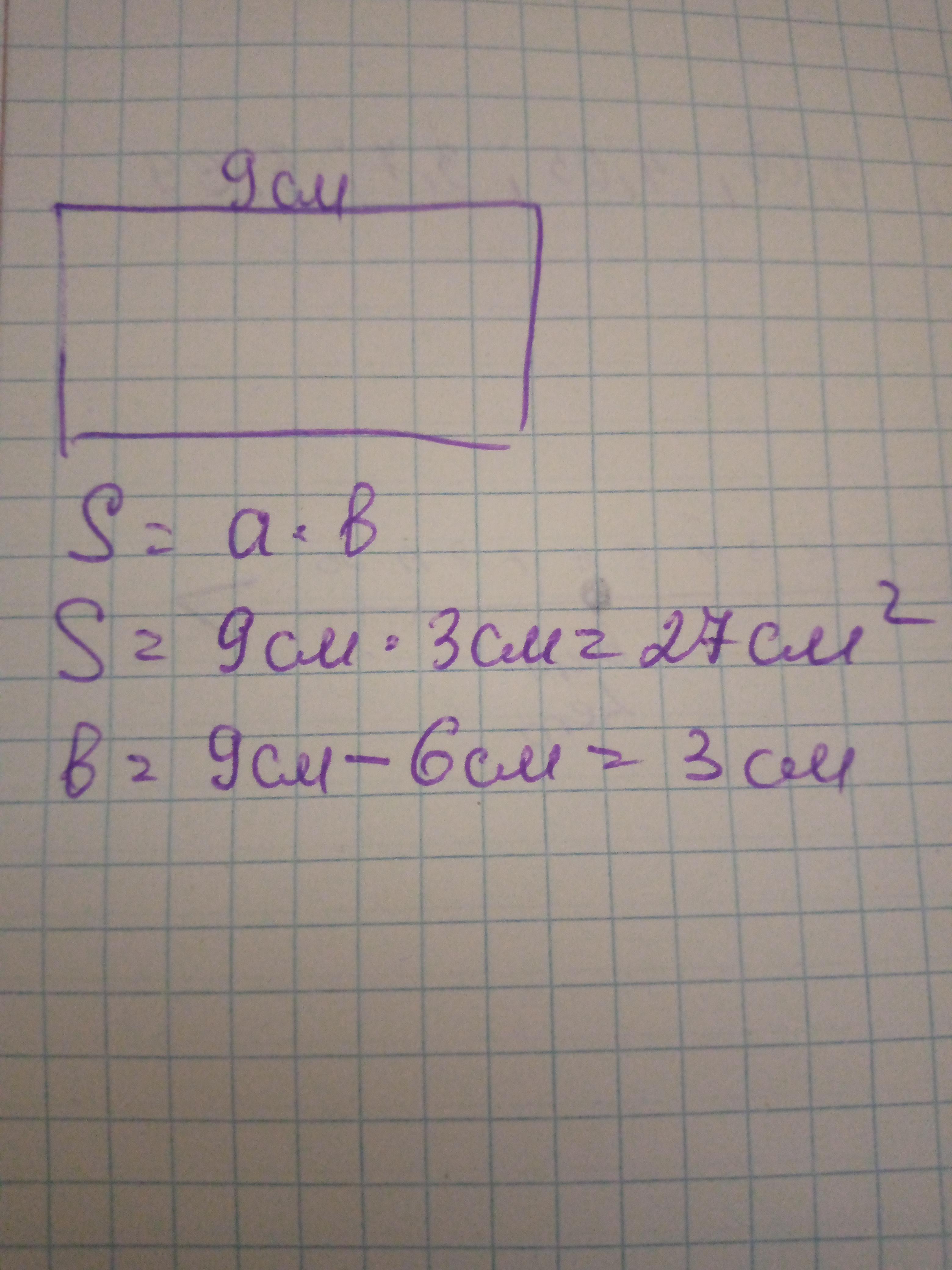 Знайди площу прямокутника, одна зі сторін якого дорівнює 9 см, а інша є меншою від неї на 6 см