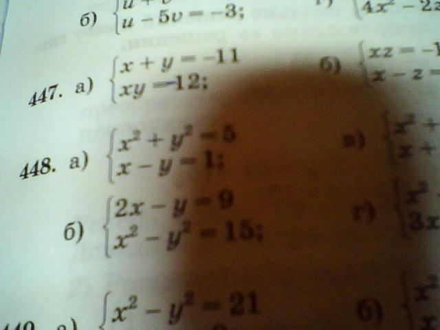 система х^2+y^2=5 и -y=1-x; умножаем -y=1-x на (-1) равно система х^2+y^2=5 и y=1+x система теперь подставляем вместо у в первом уравнении 1+х cистема x^2+(1+x)^2 - 5 = 0 и y=1+x Выписываем первое уравнение x^2+(1+x)^2 - 5 = 0 и раскрываем скобки это формула a^2+2ab+b^2 следовательно получаем x^2+(1^2+2x+x^2)-5=0 , x^2+1+2x+x^2-5=0 , 2x^2 =2x-4=0 делим на 2 , x^2+x-2=0
