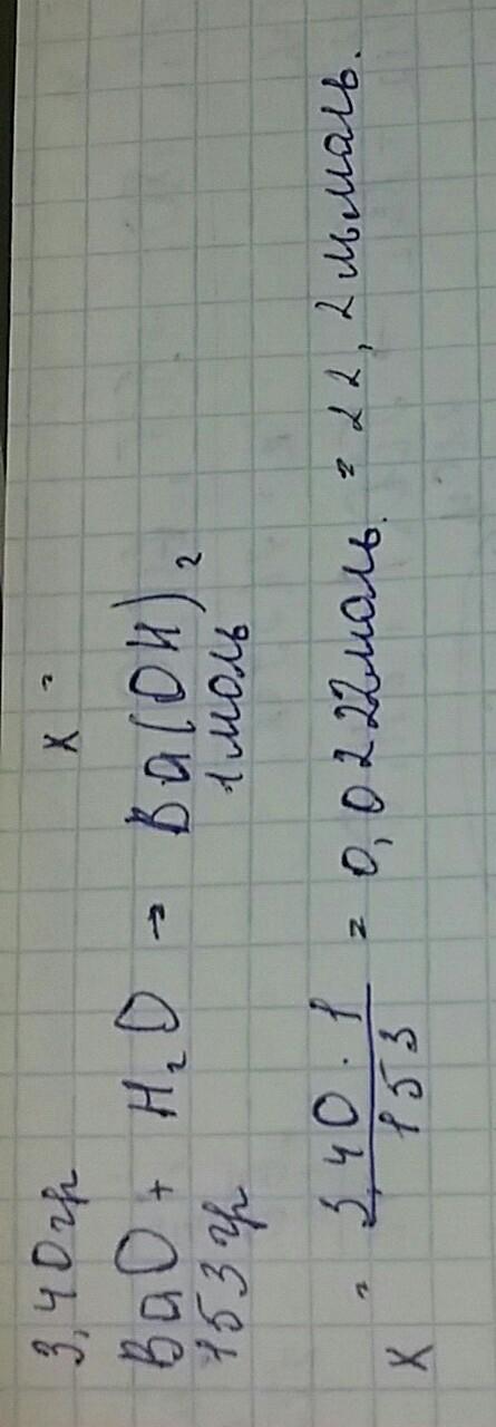 Вычислите химическое количество гидроксида бария, образующегося при взаимодействии оксида бария массой 3,40 г с избытком воды.