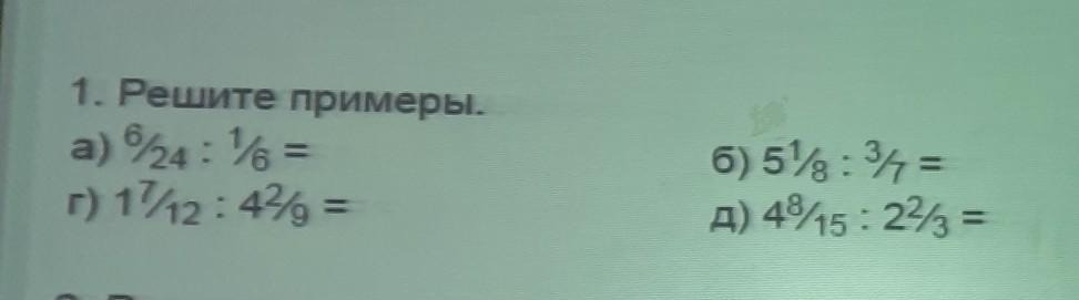 1. Решите примеры. a) /24 : 6 = r) 17/12:42 = 6) 51:37 = A) 4815: 2²3 =