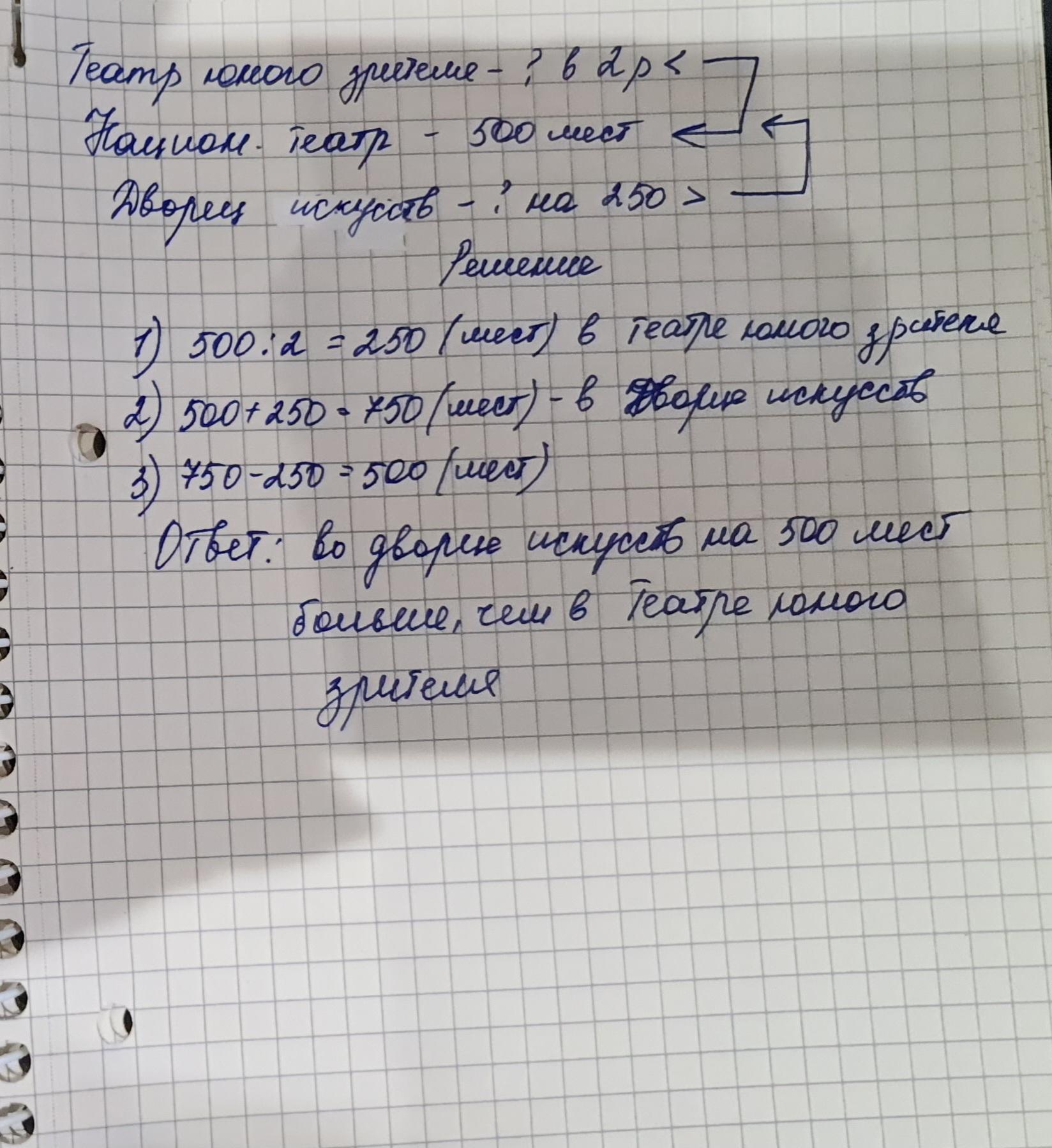 3. На сколько мест во Дворце искусств больше, чем в Театре юного зрителя?в Театре юного зрителя - ?, в 2 раза меньше в Национальном театре - 500 мест Во Дворце искусств - ?, на 250 мест больше